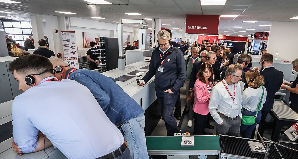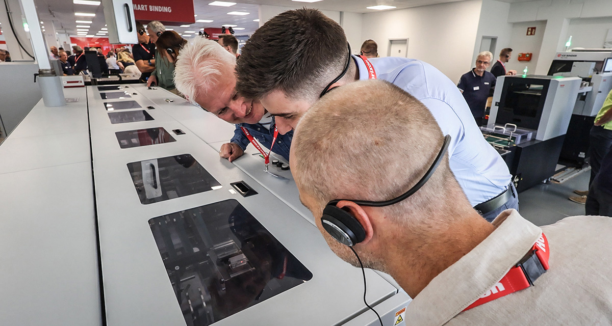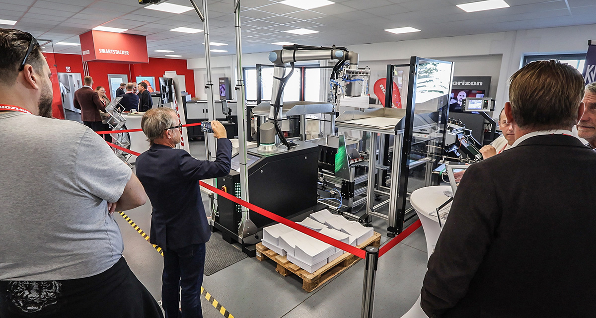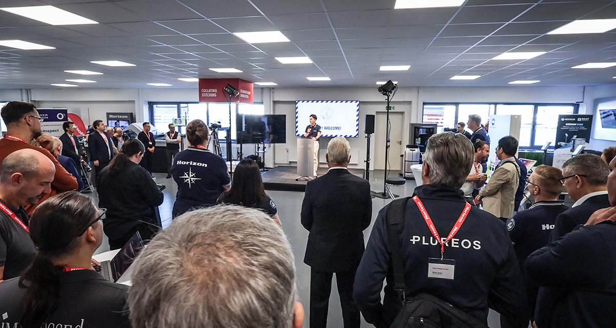 At Horizon Finishing First 2025 our iCE STITCHLINER Mark V was integrated with Hunkeler’s Generation 8 roll processing technology upstream, and Palamides’ new stacking & banding unit downstream for roll-to-banded-booklet production in a single pass.