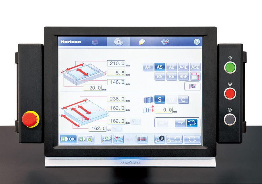 通过 15 英寸控制面板输入尺寸信息,HT-1000R 即可自动完成换版设置。选配读码器后,还可在生产过程中实现可变厚度和可变尺寸的即时自动换版。