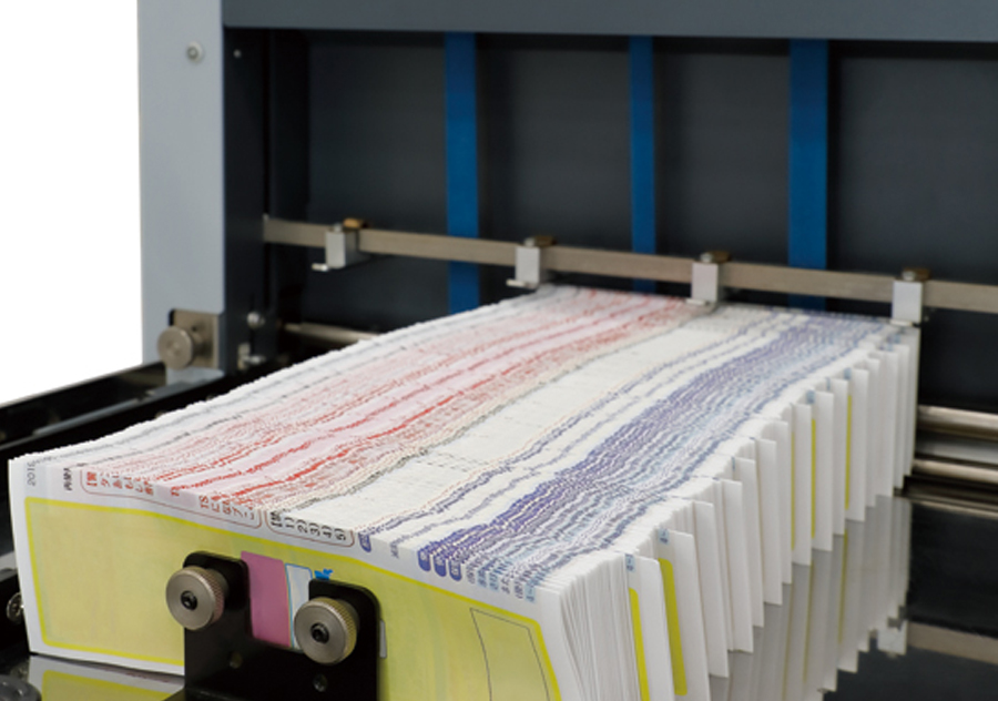 全自动8栅栏式折页机 – 透过在触摸屏选择纸张尺寸和折页方法,实现对每个部分的自动设定。分别位于进纸和收纸的双重计数器提供准确页数的生产。适合药品说明书等在包装中需要严格要求的工作。